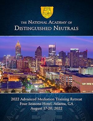 "After two years’ hiatus without in person learning, the Atlanta Retreat was just what the doctor ordered! Four days to renew acquaintances and establish new connections with some of the leading neutrals in the country — what a breath of fresh air! The Retreat always provides a provocative, thought-provoking environment for dispute resolution professionals to exchange ideas and renew our spirits. The faculty was superb, as always, and the NADN once again provided an opportunity to renew our commitment to mediation as the best alternative to resolving conflict"